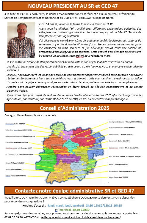 Nouveau Président du Service de Remplacement Lot et Garonne et du GED 47 et renouvellement du Conseil d'Administration élus lors de l'AG du 22/04/2025.
